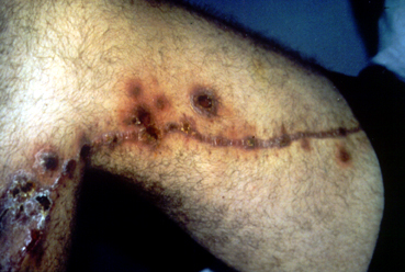 Inicialmente, ocorre o aparecimento de uma lesão papulonodular no local de inoculação do fungo. Essa lesão primária geralmente sofre ulceração, mas pode permanecer nodular com eritema sobrejacente. Lesões semelhantes ocorrem posteriormente ao longo dos canais linfáticos proximais à lesão original.