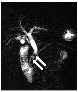 Com base na seguinte imagem de colangiorressonância de paciente do sexo feminino de 43 anos, com queixa de dor abdominal no hipocôndrio direito há 3 dias, assinale a alternativa que apresenta a principal hipótese diagnóstica.