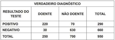 Considerando a seguinte tabela, qual é o valor preditivo positivo (vpp) encontrado no teste?