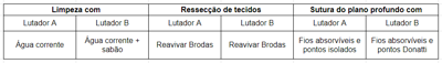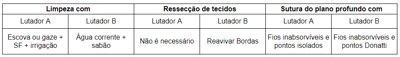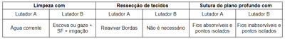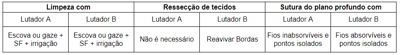 Dois lutadores de artes marciais tiveram cortes profundos na face. Foram ao hospital para a sutura, porém o lutador A compareceu imediatamente após a luta e o B ficou comemorando a vitória e, somente o fez, depois de 12h. Os dois passaram por fases de preparo da ferida, entre elas, a limpeza e ressecção de tecidos antes da sutura. As condutas indicadas para cada etapa e para cada lutador são: