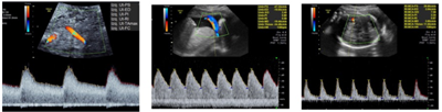 Gestante, 35 anos, primigesta, com 33 semanas de gestação, calculado pela ultrassonografia precoce, vem a consulta de pré-natal sem queixas. Ao exame físico apresenta PA 110 x 70 mmHg, altura uterina de 29 cm, BCF 140 bpm, dinâmica uterina ausente. Paciente traz ultrassom realizado com 32 semanas com peso estimado de 1350g (< percentil 3), ILA 7,8 cm, Doppler da artéria uterina, cerebral média e umbilical conforme imagem a seguir: