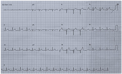 Homem, 22a, procura o Pronto Atendimento por dor precordial de forte intensidade, iniciada há quatro dias e que piora com a inspiração. Apresentou coriza, odinofagia, febre e tosse há uma semana, com melhora espontânea. Antecedentes pessoais: diabetes tipo 1 há 10 anos em tratamento com insulina NPH e regular. Exame físico: regular estado geral; ansioso; PA=122/68mmHg; FC=112bpm; FR=22irpm. Ausculta pulmonar normal. Ausculta cardíaca: ritmo regular, em dois tempos, sem sopros. Realizado ECG