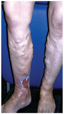 Homem de 58 anos comparece à consulta com queixa de úlcera em membro inferior D de difícil cicatrização. Refere que a ferida apareceu após trauma em casa com animal de estimação, há 6 meses, e não cicatriza desde então. Nega antecedentes mórbidos. Refere varizes de membros inferiores há 15 anos. Dor em peso e edema.