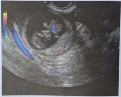 Jovem de 15 anos chega ao serviço de urgência com queixa de dor abdominal aguda em hipogástrio, que se iniciou após atividade sexual. Usa DIU de cobre e está no 14° dia do ciclo menstrual. Está apresentando náuseas e tontura no momento. PA = 100 x 60 mmHg, FC = 108 bpm. Fez teste de gravidez negativo, Hemoglobina = 10,2 g/dL. A ultrassonografia de pelve e abdome observou pequena quantidade de líquido ecogênico intraperitoneal e uma massa em projeção de anexo direito com 5 cm de diâmetro e as demais características abaixo. A hipótese diagnóstica mais provável é