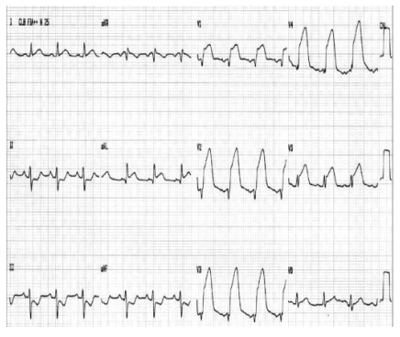 A.L.G., 38 anos, mulher, previamente hígida, sem história familiar para doença arterial coronária, deu entrada no serviço de emergência de um hospital de atenção terciária relatando quadro dor torácica opressiva iniciada há 04 horas. Um eletrocardiograma realizado na admissão se encontra abaixo. Assinale a alternativa CORRETA: