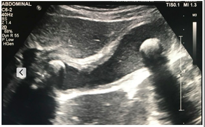 Uma mulher de 42 anos, obesa, com queixa de dor no epigastro e hipocôndrio direito irradiada para o dorso há três dias, que piora com alimentos gordurosos. Relata ainda náuseas e vômitos associado ao quadro. Nega febre e outros sinais e/ou sintomas. Ao exame: bom estado geral, temperatura axilar de 37 ºC; frequência cardíaca de 90 BPM. Pressão arterial 120x70 mmHg. Abdome flácido, doloroso à palpação em hipocôndrio direito. Sinal de Murphy positivo. O médico do pronto-socorro pediu uma ultrassonografia de abdome conforme a imagem a seguir.