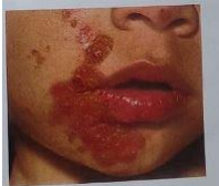 Menino, 4 anos de idade, levado ao pronto-socorro por lesão de pele há 4 dias, com febre hoje. Os pais referem que as lesões se iniciaram na perna, após uma picada de inseto, e que progrediram para fossa cubital e para a face. Ao exame clínico, o paciente encontra-se em bom estado geral, corado, hidratado, ativo, sem linfonodos palpáveis. Exame cardiovascular e respiratório sem alterações. Na pele, lesões em face, região de naso, em fossas cubitais bilaterais e em região genital, de base eritematosa, com crosta amarelada, como na figura a seguir: De acordo com o caso, qual é a hipótese diagnóstica?
