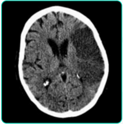 Mulher de 75 anos de idade é hipertensa em uso de enalapril 20 mg, 2 vezes ao dia, e diabética em uso de metformina. Apresentou, há 5 horas, hemiparesia direita associada com desvio de rima para a esquerda e dificuldade de falar. No exame clínico: bom estado geral, consciente, desorientada temporal e espacialmente, afebril, acianótica e anictérica. Pressão arterial = 180 x 100 mmHg; pulso = 110 bpm, irregular. Ausculta cardíaca com bulhas arrítmicas e normofonéticas em dois tempos, sem sopros. Apresenta hemiparesia completa e desproporcionada à direita, disartria, afasia motora e hemi-hipoestesia completa. O restante do exame clínico está sem alterações. Foi realizado ECG de 12 derivações que confirma a impressão de fibrilação atrial e TC de crânio (a seguir). A angioTC revela oclusão da artéria cerebral média esquerda. Sobre o quadro em questão, qual das alternativas está correta?