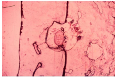 Observe a imagem a seguir que representa o achado de um exame direto do raspado de uma lesão cutânea.