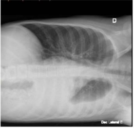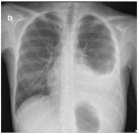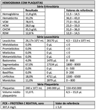 Paciente de 10 anos, feminino, previamente hígida, apresenta tosse e coriza há 7 dias e febre há 5 dias, prostração e dor abdominal há 2 dias. Nega trauma ou qualquer lesão ou infecção prévia ao quadro atual. Ao exame físico está em regular estado geral, pálida, com FC: 120 bpm, FR: 31 ipm, discreta tiragem de fúrcula sem outros sinais de desconforto respiratório. Ausculta cardíaca sem alterações, ausculta pulmonar com crepitações, diminuição de murmúrio vesicular e da ausculta da voz em base esquerda. Abdome flácido, levemente doloroso à palpação profunda. Oximetria de 95% em ar ambiente. Solicitado teste rápido para influenza A positivo. Hemograma e proteína C reativa (abaixo) e hemocultura (em andamento) e Raio X de tórax em pé e decúbito lateral esquerdo (abaixo).