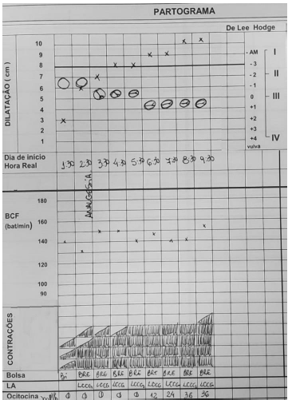 Paciente, 36 anos, secundigesta com parto normal há 16 anos, idade gestacional 39 6/7 semanas. Pré-natal sem intercorrências. Encontra-se no centro obstétrico em trabalho de parto espontâneo. Exame clínico: bom estado geral, normotensa, normocárdica, afebril. Exame obstétrico: altura uterina 39 cm. Partograma e cardiotocografia abaixo: A conduta obstétrica adequada foi realizada e a paciente apresentou hemorragia e choque hemorrágico.