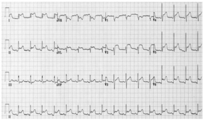 Paciente de 48 anos com quadro de dor torácica de início súbito, de moderada intensidade, cortante, sem irradiações, com piora à inspiração profunda, procurou o Pronto Atendimento (PA) após 6 horas do início da dor. Na admissão, encontrava-se com pressão arterial de 136 x 76 mmHg; frequência cardíaca de 88 bpm; pulsos cheios, amplos e simétricos bilateralmente. À ausculta cardíaca notava-se um rangido em borda esternal esquerda, melhor audível com o diafragma. Ausculta pulmonar sem alterações relevantes. Hipertenso, tabagista e história familiar de pai com infarto agudo do miocárdio aos 60 anos. Exame laboratorial revelou troponina de 2,54 ng/ml (VR: menor que 0,40). Realizado ECG abaixo: (VER IMAGEM)