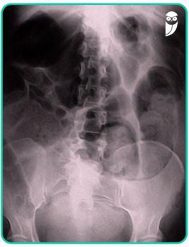Paciente masculino, 67 anos, admitido na emergência queixando-se de dor abdominal em cólica, iniciada há 4 dias, com piora progressiva desde então. Refere que há 5 horas vem apresentando vômitos “esverdeados” e que não evacua desde o início do quadro, e hoje não eliminou flatos. Relata ainda que apresentou dois episódios de hematoquezia nos últimos 04 meses. Nega comorbidades conhecidas. Ao exame físico: REG, descorado 2+/4+, desidratado 2+/4+, anictérico, afebril. FC 102 bpm. PA 110 x 80 mmHg. FR 16 irpm. Abdome globoso, distendido, doloroso à palpação, timpânico. Sem sinais de irritação peritoneal. Toque retal: massa palpável na luz retal, endurecida, a cerca de 06 cm da borda anal, estenosante. Exames complementares: Hb 8,9 / Ht 26,7 / Leucócitos 12.500 cel/mm3, sem desvio / Cr 1,2 / Ur 40 / Na 143 / K 3,9. Realizada radiografia de abdome (imagem a seguir) e tomografia computadorizada de abdome e pelve com contraste, que identificou tumor no reto, de aproximadamente 5 cm de extensão, estenosante, provável T3. Sem sinais de doença hepática ou peritoneal.