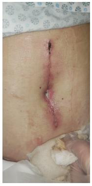 Paciente do sexo feminino, 62 anos, foi submetida à laparotomia exploradora por abdome agudo perfurativo, sendo evidenciada, no intraoperatório, uma úlcera péptica perfurada. O tratamento intraoperatório foi realizado com ulcerorrafia à Graham. Ela recebeu alta no 3º dia pós-operatório e retornou para consulta ambulatorial, referindo estar apresentando boa aceitação de dieta e evacuar diariamente. Paciente queixa-se, apenas, de saída de secreção pela incisão, esbranquiçada e em pequena quantidade. A ferida operatória está evidenciada na imagem abaixo.