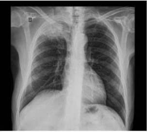 Paciente, sexo masculino, 65 anos de idade, hipertenso e tabagista 60 anos/maço, vem encaminhado da UBS por apresentar, há 3 meses, tosse seca, pletora facial e edema de membros superiores. Relata ainda 3 episódios sincopais no último mês, após acessos de tosse. Ao exame físico, apresenta bom estado geral, pletórico, turgência jugular bilateral. MVF. BRNF em 2 tempos. Abdome sem alterações. Edema de membros superiores 2+/4+. TC de crânio demonstra lesão expansiva intracraniana. A radiografia de tórax apresenta a imagem a seguir. De acordo com o quadro descrito, cite um achado da radiografia de tórax.