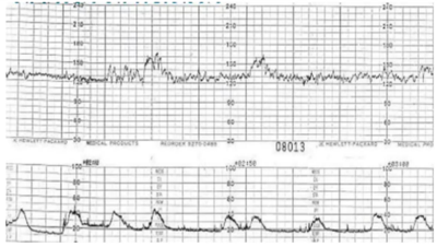 Primigesta, 20 anos, 41semanas de gestação, assintomática, comparece ao serviço de pronto atendimento de uma maternidade com desejo de resolver a gestação. Ao exame: PA 110 x 70 mmHg, FC: 80 bpm, Saturação de O₂ 98%. Contrações uterinas irregulares de baixa intensidade e não percebidas pela gestante como dolorosas. BCF: 144 bpm. Toque vaginal: colo centralizado, consistência intermediária, 50% apagado e dilatado 1,5 cm, membrana íntegra, feto no plano -2 de DeLee. US realizado hoje evidencia feto cefálico, com dorso à esquerda, IG de 41 semanas (calculado pelo US de 9 semanas), peso fetal estimado de 3580g e maior bolsão de líquido amniótico de 35 mm. Realizada cardiotografia (imagem anexa).