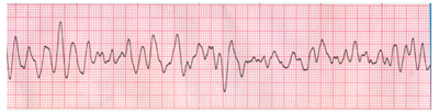 Você está de plantão e é chamado para atender um paciente que está irresponsivo e sem pulsos. Ao instalar as pás do monitor-desfibrilador bifásico, você identifica o ritmo a seguir.