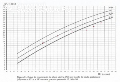 No acompanhamento pré-natal da gestante deve ser realizada a medida da Altura uterina em todas as consultas e anotação no gráfico de altura uterina x idade gestacional. O registro final da Sra. Maria José, 39 anos mostra esse pontilhado que pode ser indicativo de:
