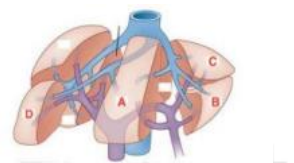 Nas cirurgias hepáticas, o enxerto do lobo esquerdo é baseado nos segmentos ilustrados abaixo pelas letras A, B, C e D, com influxo da artéria hepática esquerda e veia portal esquerda e efluxo das veias hepáticas média e esquerda, que frequentemente possuem um tronco confluente na veia cava. Corresponde aos segmentos A, B, C e D, respectivamente: