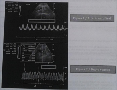 A. A figura 1 retrata um estudo dopplervelocimétrico da artéria umbilical com espectro de fluxo compatível com diástole reversa; nesses casos espera-se cerca de 70% de lesões vasculares na placenta.