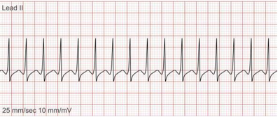 Uma menina de 9 anos de idade deu entrada no DE letárgica e com palidez cutânea-mucosa. Iniciado atendimento inicial, observa–se a pressão arterial éde 69/48 mmHg, a frequência cardıacá éde 175 bpm e a frequência respiratória éde 16 irpm. A SaO2 não édetectável. O tempo de preenchimento capilar éde 6 segundos. O acesso IV foi estabelecido. O ritmo cardıacó da paciente émostrado abaixo: