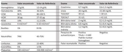 Uma mulher com 33 anos de idade procura o ambulatório de clínica médica devido a dores articulares há 3 meses. Refere o acometimento de mãos (interfalangeanas proximais e metacarpofalangeanas), punhos e joelhos. Ao exame físico, apresenta sinais de artrite nessas articulações. Foram solicitados exames laboratoriais para a investigação diagnóstica e os resultados são apresentados a seguir.