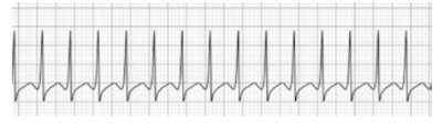 Um paciente, 7 anos de idade, previamente hígido, com história de dor torácica súbita deu entrada no PSI. Peso 30 kg. Exame físico: o menino está agitado; acianótico; anictérico; afebril; taquicárdico; e taquipneico. Ausculta pulmonar sem alterações; frequência respiratória de 55 ipm, sat 91% AA; frequência cardíaca de 195 bpm; pressão arterial de 82 x 58 mmHg, abdome RH + sem alterações. O monitor a seguir apresenta o ritmo apresentado pelo paciente.