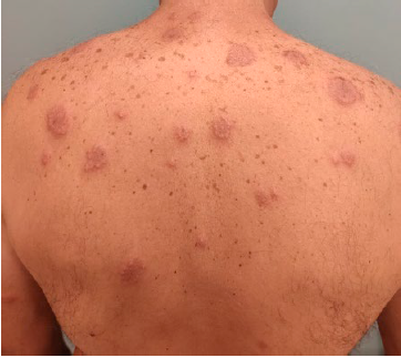 Um paciente portador de leucemia mieloide aguda foi encaminhado para o ambulatório de dermatologia por conta de lesões cutâneas há 4 dias (ver imagem). Não havia lesões nas mucosas. Além das lesões de pele, o paciente apresentava febre e nos exames laboratoriais havia uma leucocitose com neutrofilia e aumento de PCR.